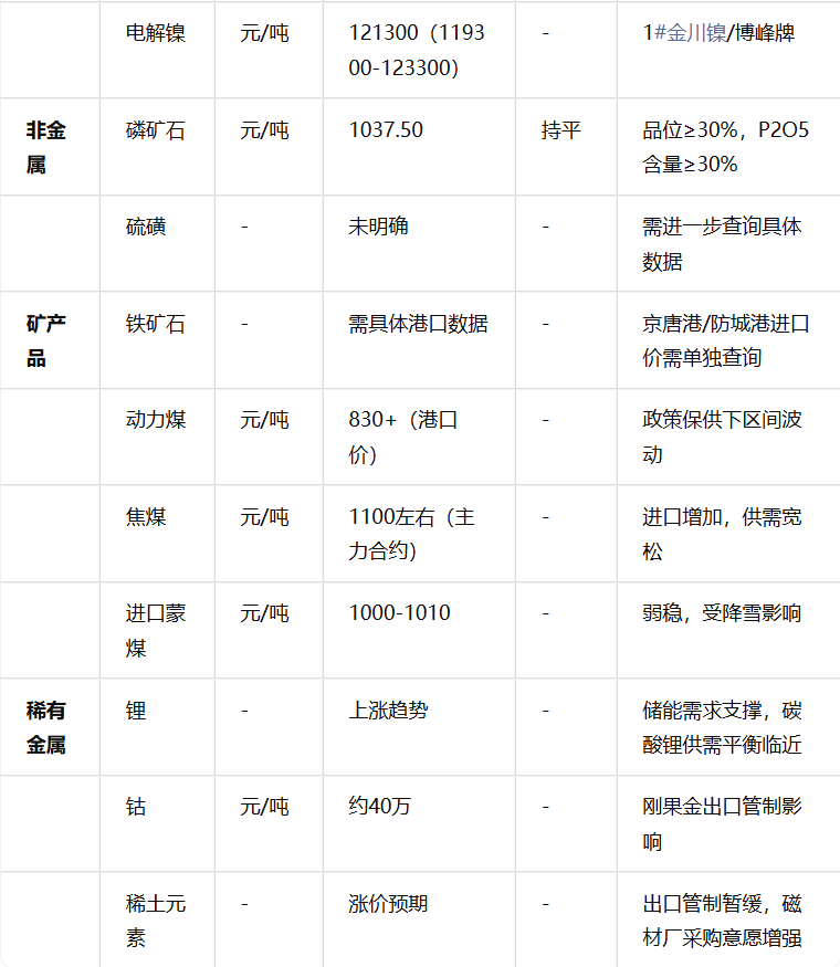 :硫磺、铁矿石等部分品种需具体港口或规格数据,建议通过专业平台(如上海期货交易所、港口官网)进一步查询。 稀有金属
