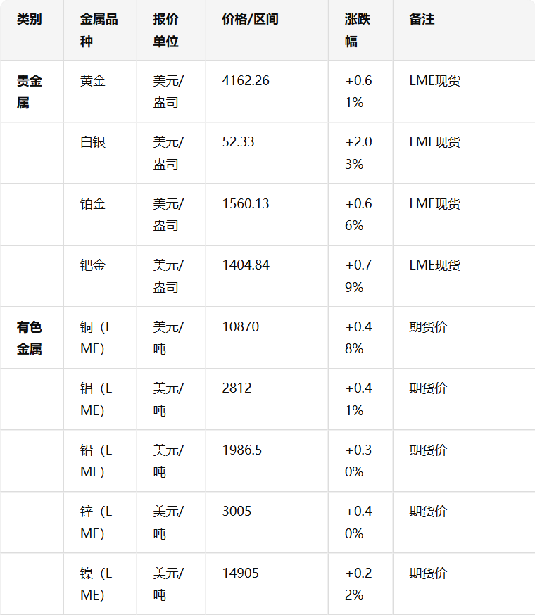 :锂、钴价格受政策与需求双重影响,稀土因出口管制调整呈现涨价预期。 涨跌幅