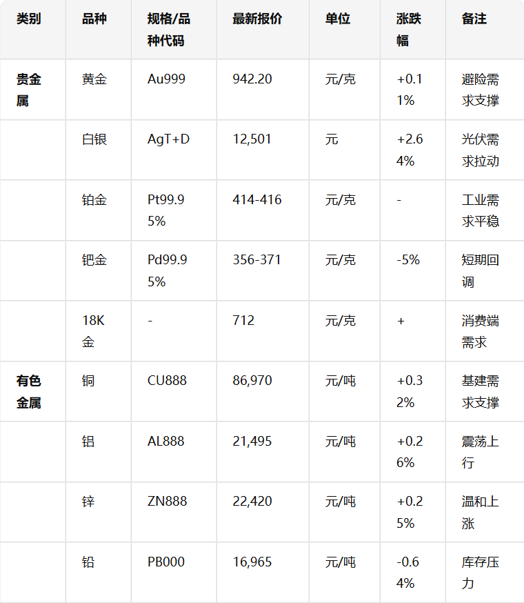 :基于前一日收盘价计算,部分品种因数据更新频率差异未标注具体涨跌幅。 备注