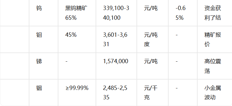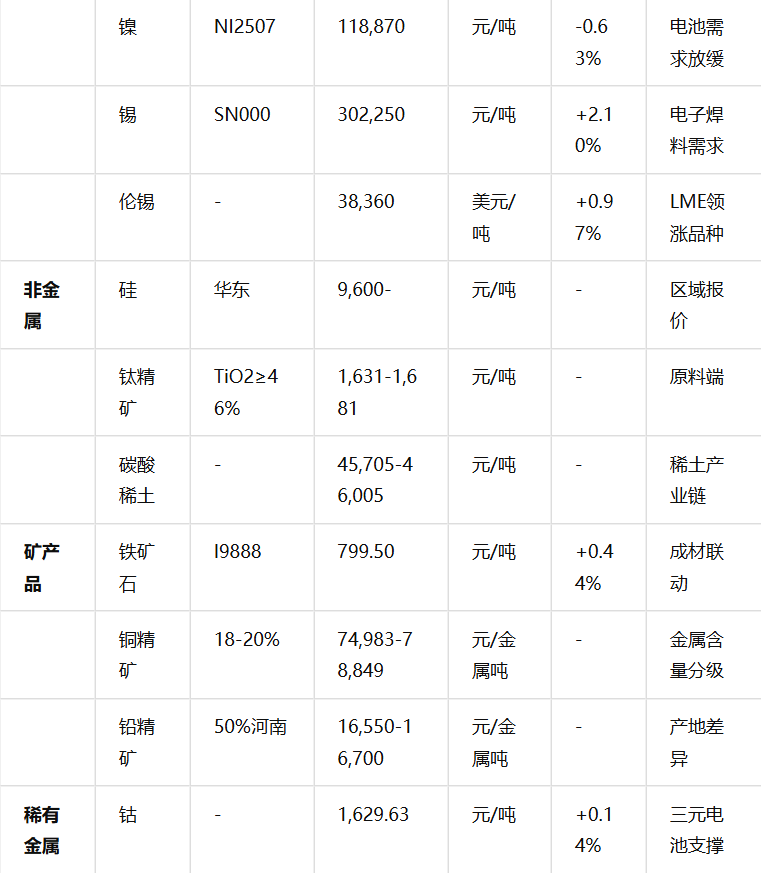 :贵金属以元/克或元/吨为主,有色金属及矿产品多采用元/吨,稀有金属根据品种特性采用元/吨、元/千克或元/吨度。 涨跌幅