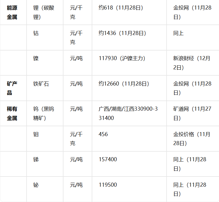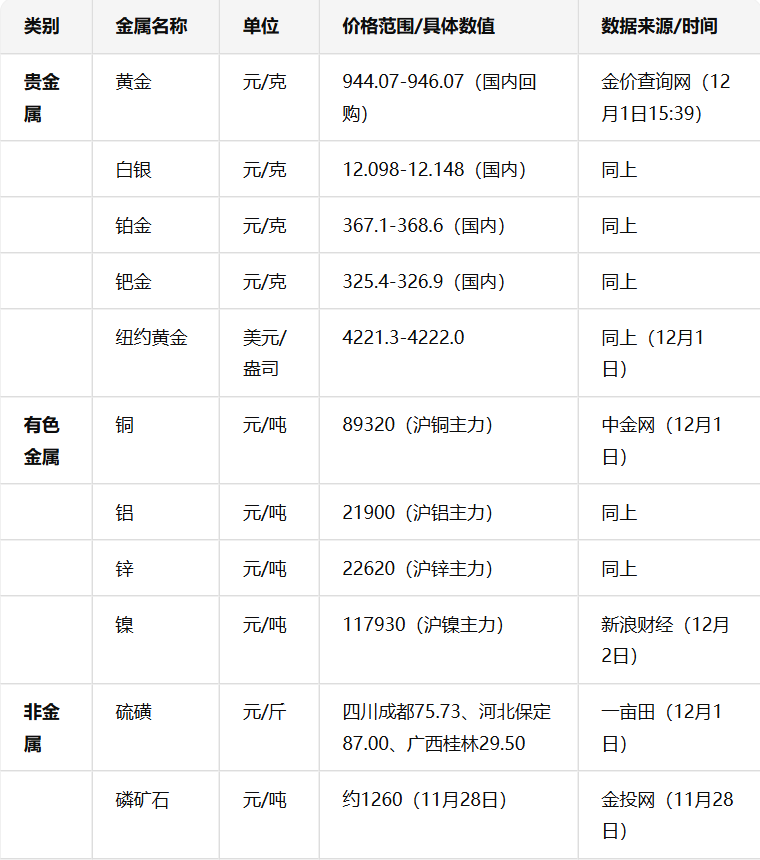:部分数据为11月28日-12月1日期间采集,已优先选取最近日期;贵金属国际价格实时波动,建议以实时交易平台为准。 单位统一
