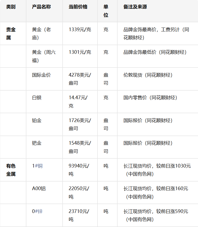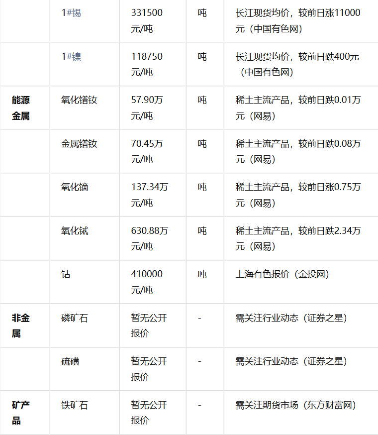 贵金属价格包含品牌零售价与国际报价,黄金回收价约953元/克; 有色金属以长江有色金属现货市场数据为主,含13%增值税; 能源金属中稀土产品价格来自包头稀土交易所,钴价来自上海有色网; 非金属及部分矿产品因市场波动大或数据透明度低,暂未收录具体报价; 所有数据均为2025年12月12日实时行情,建议交易前核实最新价格。