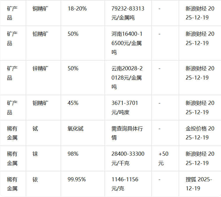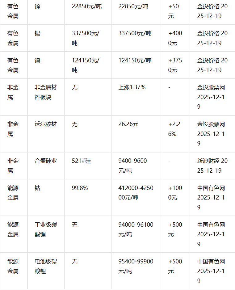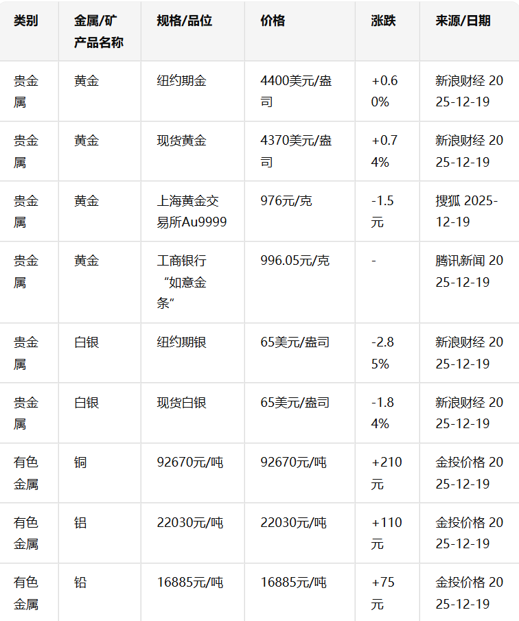 贵金属价格包含国际期货、现货及国内交易所报价,黄金工费未计入零售价; 有色金属及能源金属价格主要参考上海有色金属网及金投网数据; 非金属板块涨幅为板块整体表现,具体个股价格来自股票交易平台; 矿产品价格涵盖精矿及原料,部分品种如钛精矿、红土镍矿有FOB报价; 稀有金属中铽需实时查询具体行情,铼、铱等价格来自权威市场监测。