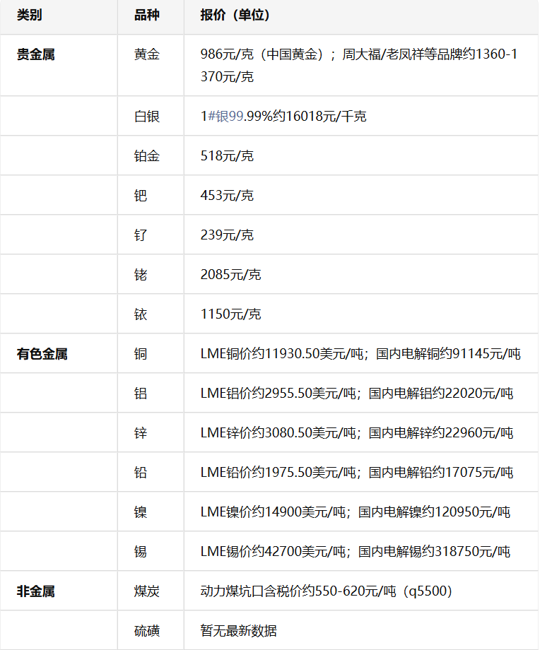 :报价已统一为元/克、元/吨、美元/吨等标准单位,便于对比。 缺失数据