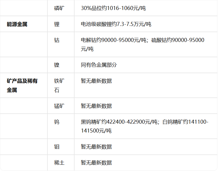 :部分品种(如硫磺、铁矿石、锰矿、钼、稀土)因市场信息更新延迟或数据源有限,暂未获取到最新报价,已标注“暂无最新数据”。 品牌差异