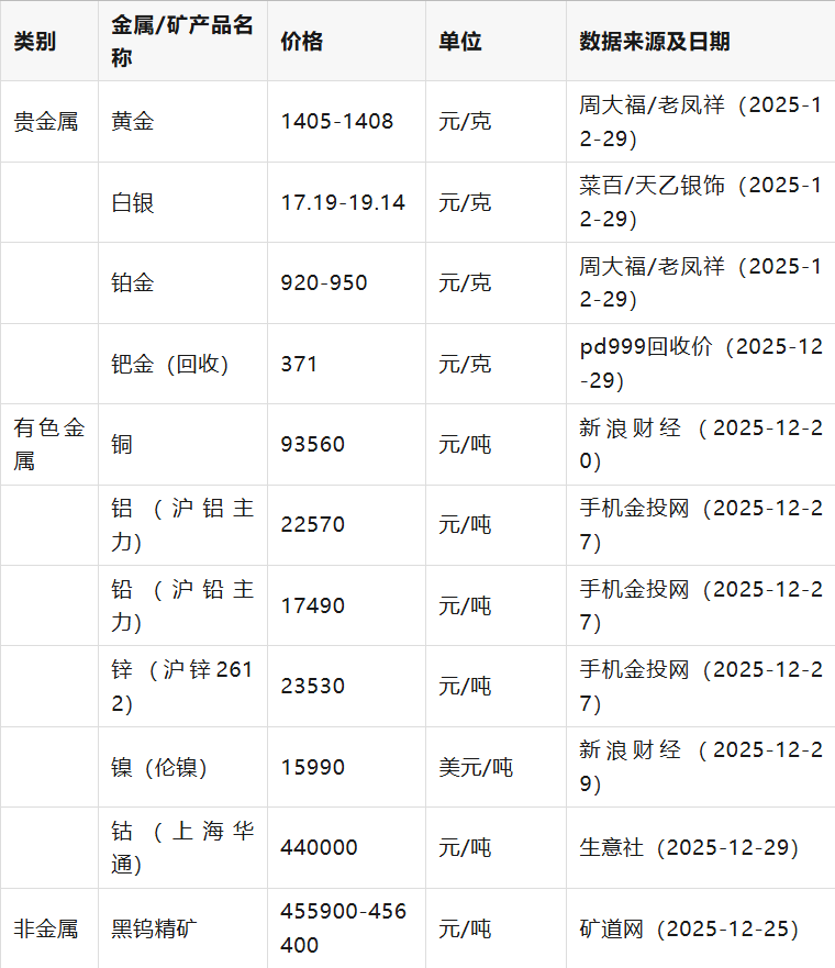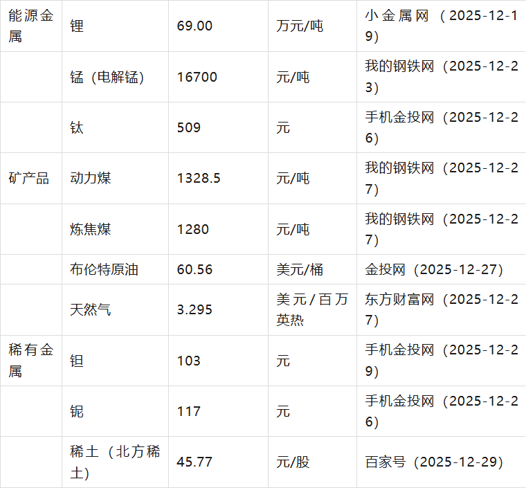 贵金属价格以主流品牌零售价为主,回收价单独标注; 有色金属价格包含期货主力合约及现货价格; 能源金属中锂、锰、钛价格取自近期典型交易日; 矿产品中煤炭、石油、天然气价格包含国内外主要品种; 稀有金属中钽、铌价格取自最新交易日,稀土以北方稀土成交价为例。