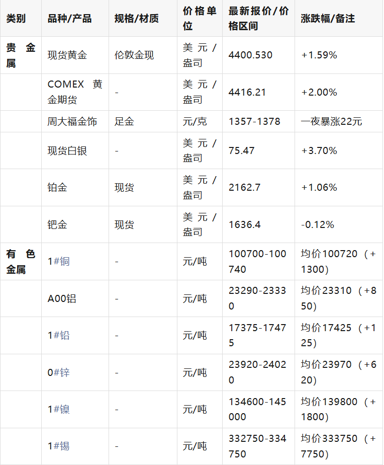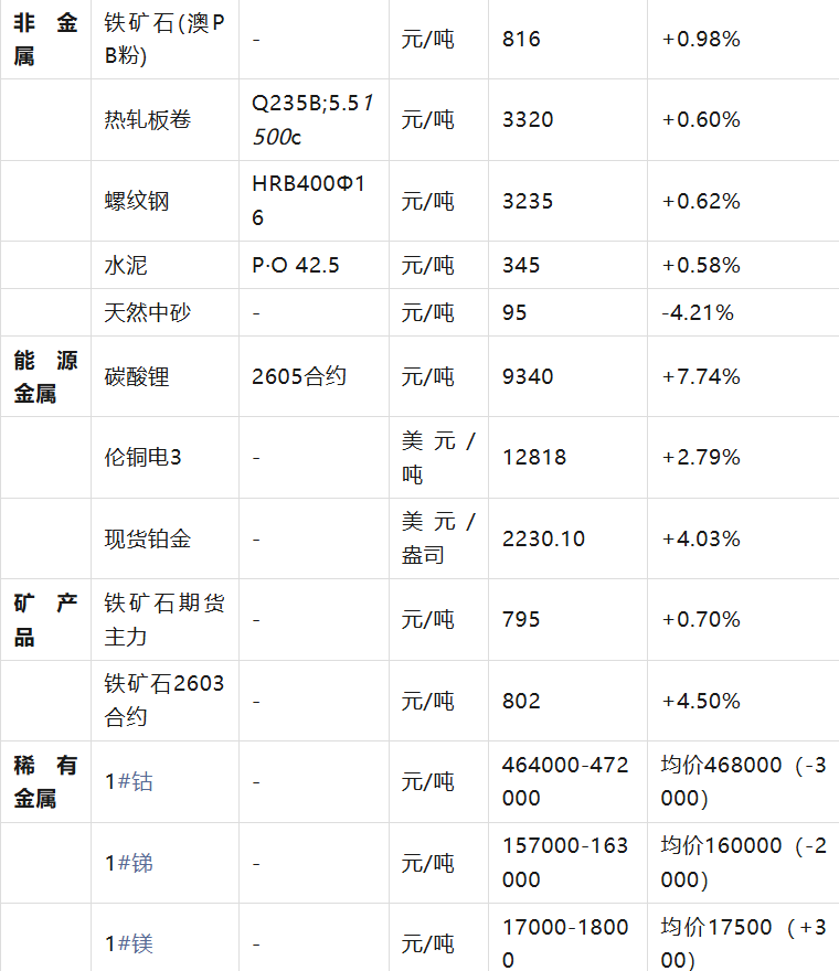 贵金属价格主要参考伦敦金现、COMEX期货及国内品牌金饰实时行情,白银、铂金、钯金为现货价格。有色金属价格来自长江有色金属现货市场及中铝集团报价,包含铜、铝、铅、锌、镍、锡等主流品种。非金属涵盖铁矿石、钢材、水泥、砂石等建材及燃料,数据来自物资价格数据网及期货市场。能源金属包括碳酸锂、伦铜电3及铂金期货,反映新能源及工业金属需求。矿产品以铁矿石期货主力合约及近月合约为代表,稀有金属包含钴、锑、镁等小金属。涨跌幅基于当日最新价与前一日收盘价对比,部分品种标注具体涨跌值。