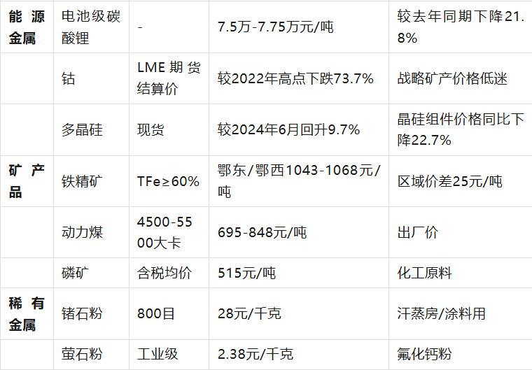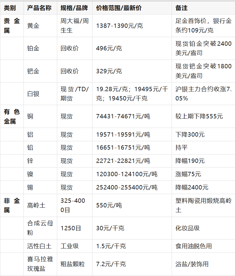 贵金属价格主要参考2026年1月7日国内品牌金店及国际市场数据;有色金属、能源金属指数来自当日股市收盘数据(如有色金属指数10049.22,能源金属指数2955.61)。非金属及矿产品价格取自近期市场报价,部分产品因规格差异存在价格区间。稀有金属数据结合了市场行情及特定产品报价(如锗石粉、萤石粉)。所有价格均为含税价,增值税率按行业常规执行(如13%或3%)。