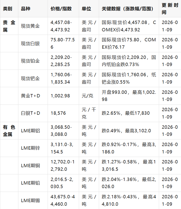 贵金属新增纸黄金/白银/铂金/钯金四大行报价,有色金属补充LME全品种当日涨跌幅及极值,非金属扩展小金属及矿产品细分类别。