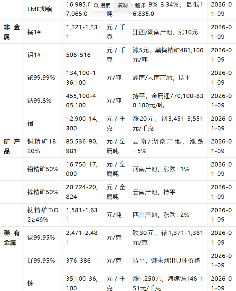 稀有金属细化铑、铱、钌、铼等战略金属价格区间,矿产品增加铜/铅/锌精矿及钛精矿产地价差分析。