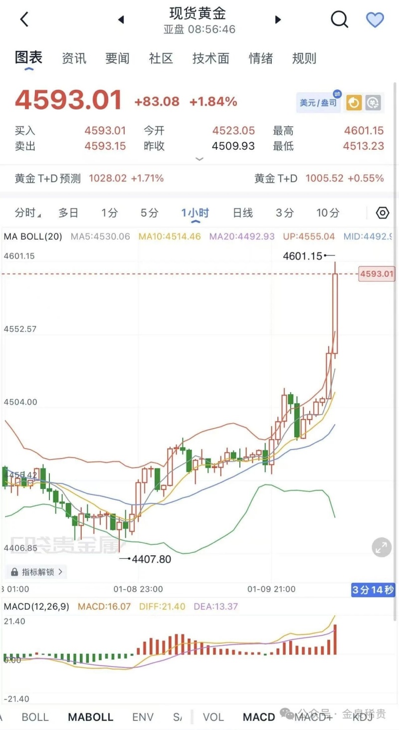 2026年1月12日早盘,现货黄金(伦敦金现)强势拉涨,盘中突破前高4550.520美元/盎司,最高触及4601美元/盎司的历史新高。截至发稿,伦敦金现报4590.66美元/盎司,涨幅1.81%,COMEX黄金期货同步跟涨,日内涨幅超2%,新年首月累计涨幅达280美元,上行势头强劲。