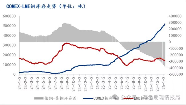 截至1月9日,COMEX铜库存为517999吨,较9月9日增长68.3%。同时,COMEX铜库存和LME铜库存差已扩大至创纪录的379024吨。