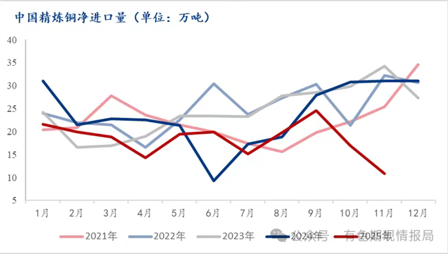 2025年1-11月,中国精炼铜进口量为270.73万吨,同比2024年下降9.3%。而1-11月份,中国精炼铜出口量为49.39万吨,同比大增57.4%。11月的净进口量仅为10.79万吨,为近年来的同期最低水平。