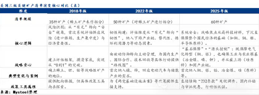 美国三版关键矿产清单演变对比