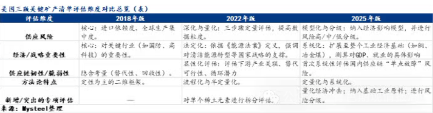 美2018年、2022年以及2025年三版关键矿产清单的演进脉络是:从“识别有哪些风险”到“如何量化和管理这些风险”,再到“如何预防系统性风险”。评估维度不断扩充、深化和量化,最终服务于构建一个更具韧性的国家工业与国防材料供应链。