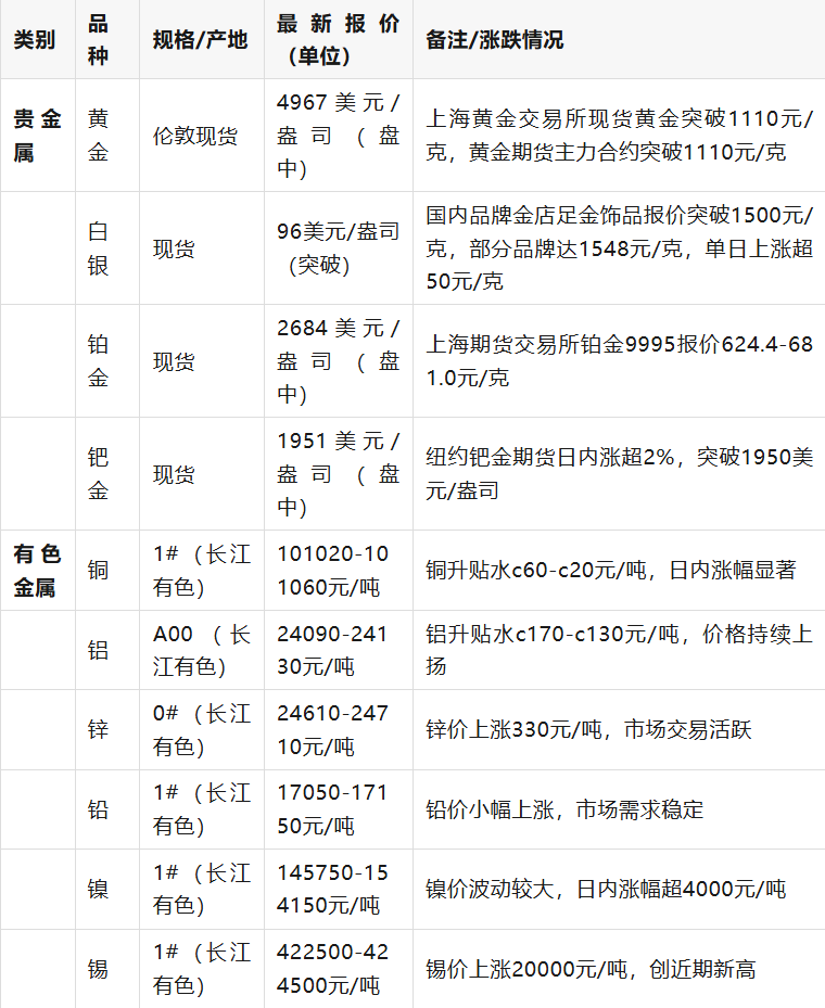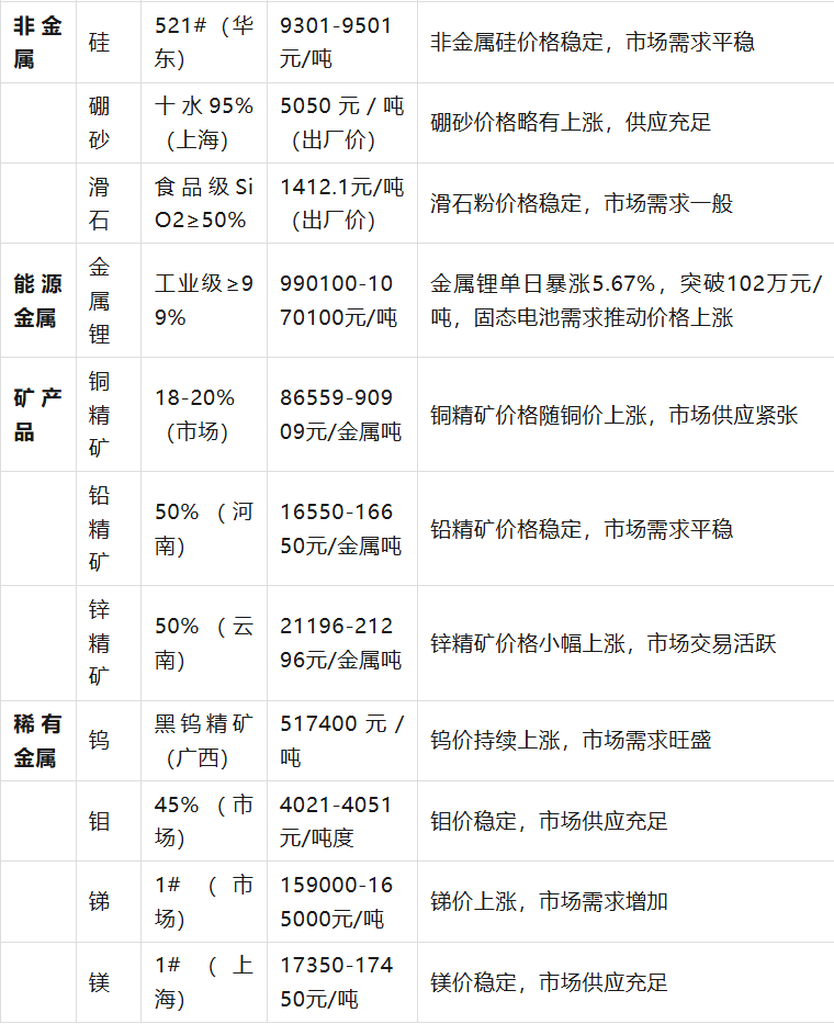 以上数据综合自上海黄金交易所、伦敦金属交易所、长江有色金属网、新浪财经等权威平台,反映了2026年1月23日各类金属及矿产品的实时行情。贵金属方面,黄金、白银受避险情绪及美联储降息预期推动,价格创历史新高;有色金属中铜、铝、锌等品种因需求回暖及供应紧张,价格持续上涨;能源金属中金属锂因固态电池技术突破,价格暴涨;稀有金属中钨、锑等品种因供需格局改善,价格稳步上行。市场整体呈现量价齐升态势,投资者需关注宏观政策及地缘政治风险对价格的影响。
