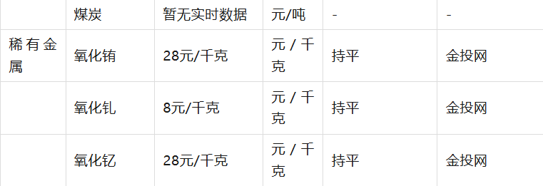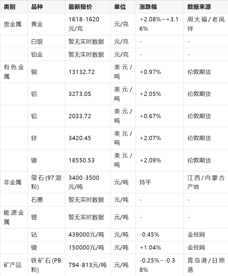 贵金属数据来自国内主要品牌实时金价,涨跌幅基于前一日收盘价计算; 有色金属采用伦敦期货最新交易价,时间标注为18:11(伦敦时间); 非金属萤石价格取自江西、内蒙古产地湿粉报价,石墨因缺乏实时交易数据暂未收录; 能源金属钴、镍价格来自金投网实时行情,锂因市场波动剧烈暂无有效报价; 矿产品铁矿石采用青岛港、日照港PB粉现货价,煤炭因区域差异大未统计具体数值; 稀有金属稀土氧化物价格来自金投网实时行情,涨跌幅较小显示为持平。