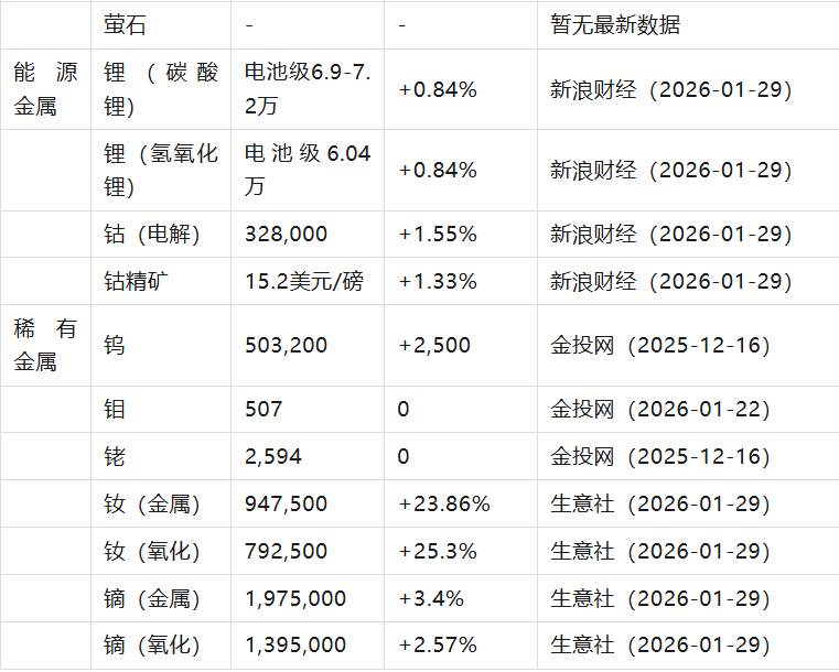 硫磺数据为1月27日最新,萤石暂无2026年1月29日数据;