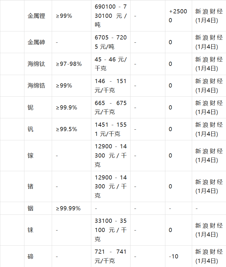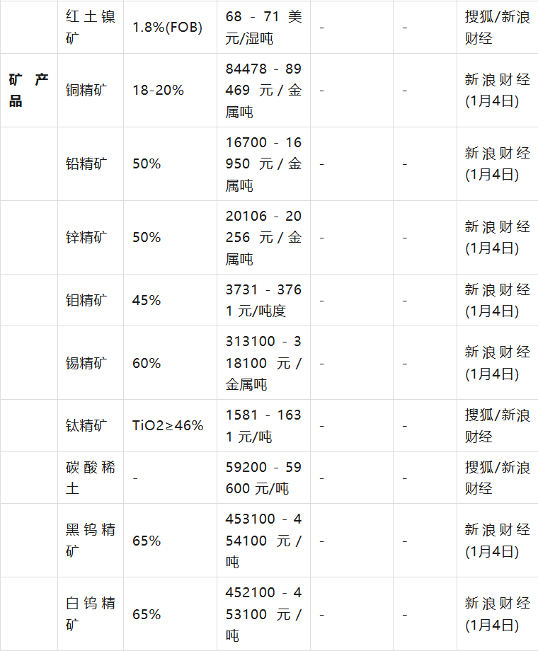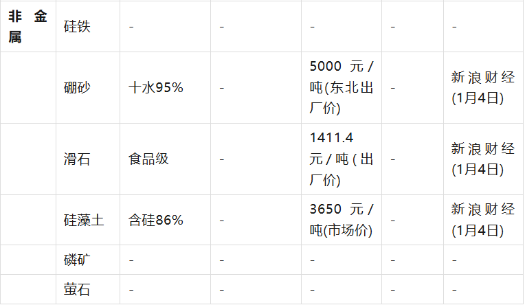 科矿|1月6日金属、矿产品及非金属现货行情报价单