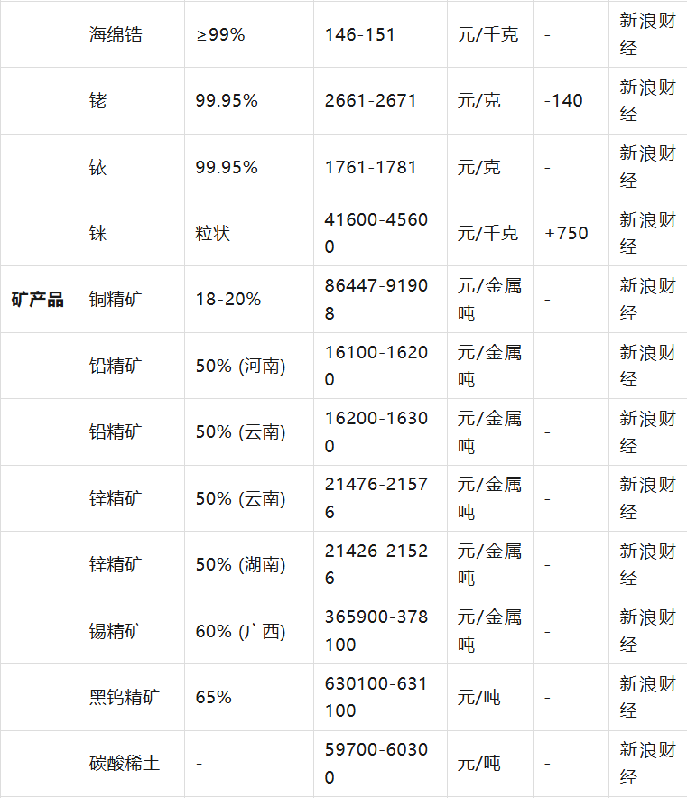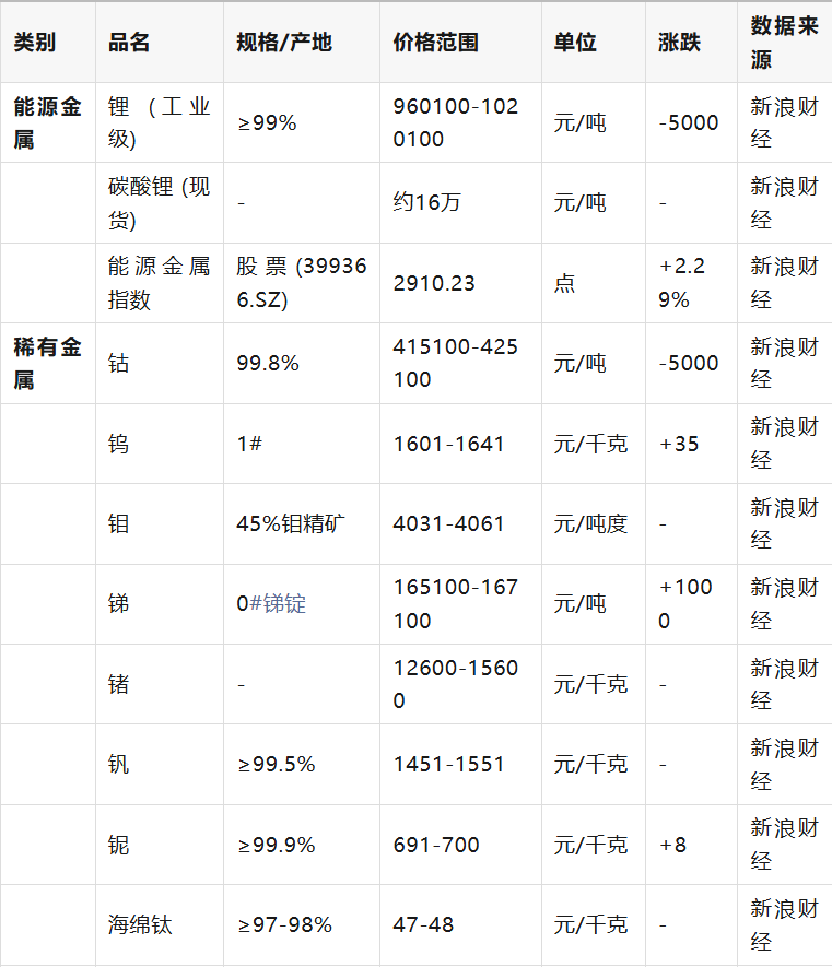 能源金属板块股票指数上涨,部分稀有金属和矿产品价格出现回调。