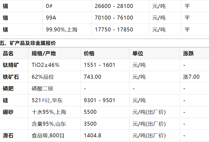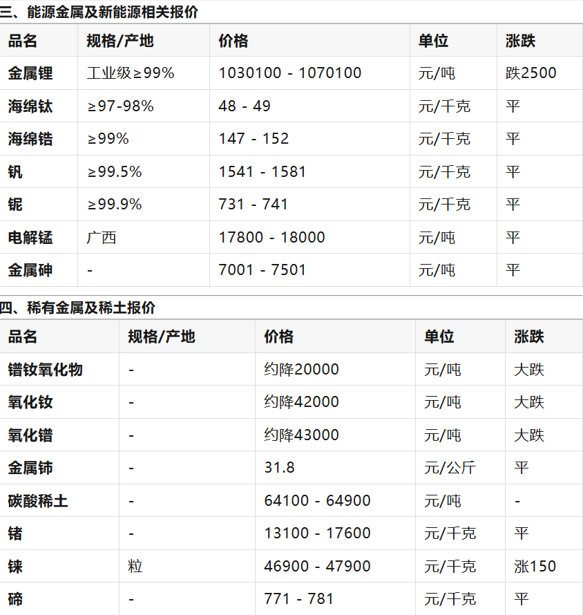 :稀土价格(特别是镨钕系列)出现普遍且较大幅度的下跌,主要受前期价格过高及下游磁材企业补货意愿不强影响。钨价则继续大幅上涨。 能源金属