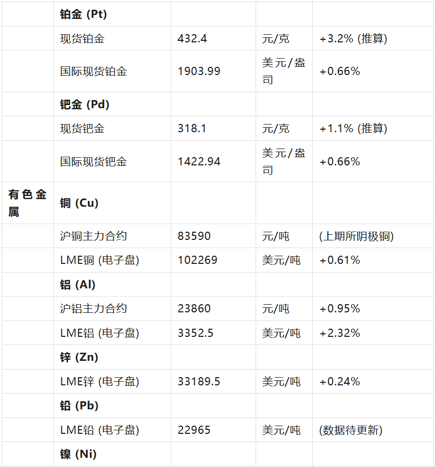 :以上数据综合整理自上海黄金交易所、上海期货交易所、LME(伦敦金属交易所)、同花顺iFind、生意社、金投网、温岭市人民政府门户网站等公开信息。