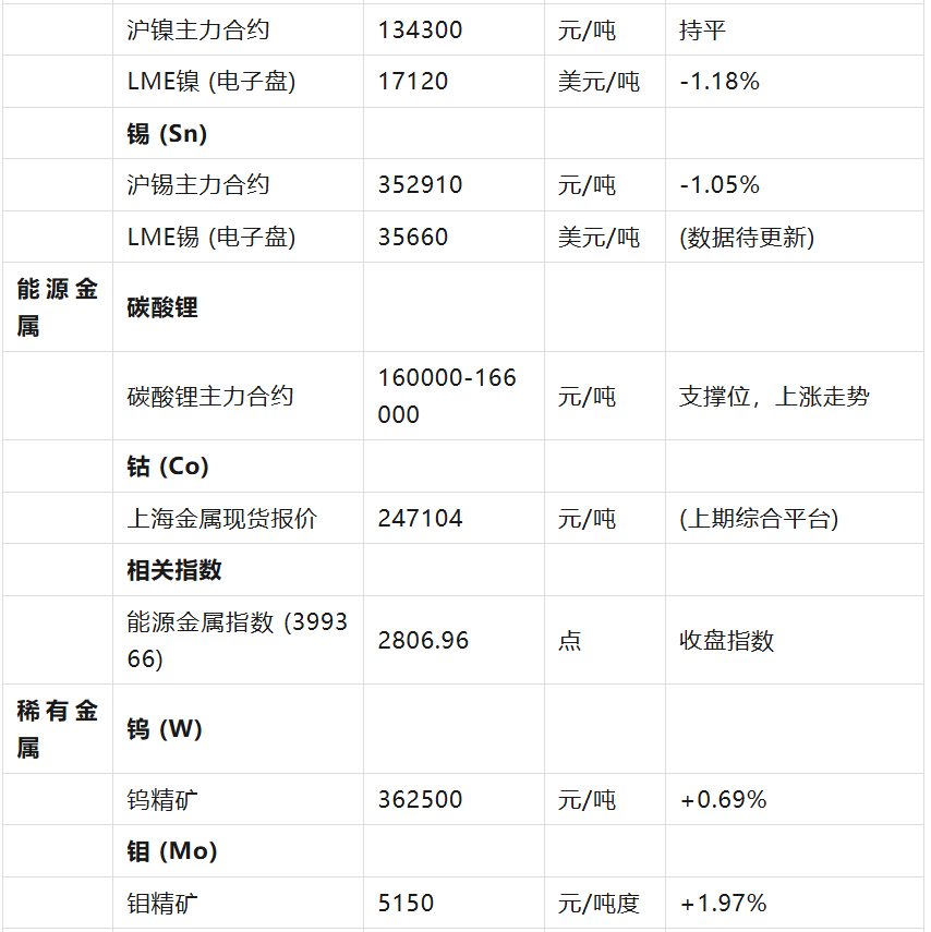 :能源金属指数今日收跌,但碳酸锂期货主力合约显示价格在16万元/吨上方获得支撑,呈上涨走势。稀有金属如钨、钼、锑、铋等价格保持坚挺,小幅上涨。稀土市场中,氧化镝价格继续上调。 非金属与矿产品