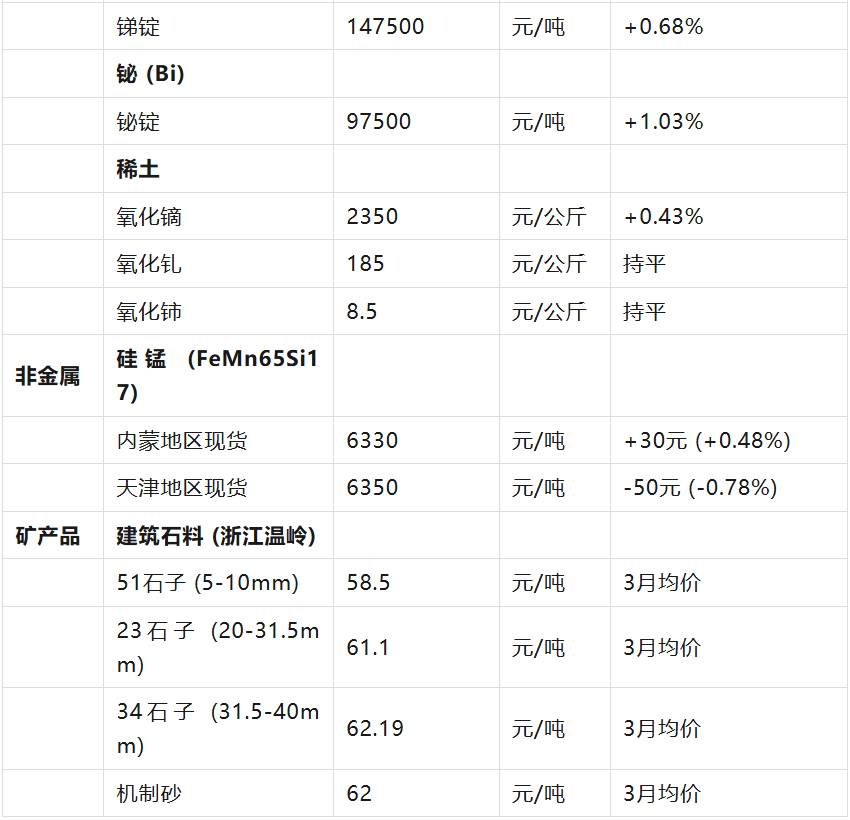 :硅锰合金现货价格区域分化,内蒙古地区上涨,天津地区微跌。浙江温岭市发布的3月份建筑用石料矿产品价格保持稳定,石子和机制砂价格在58-62元/吨区间。 数据来源