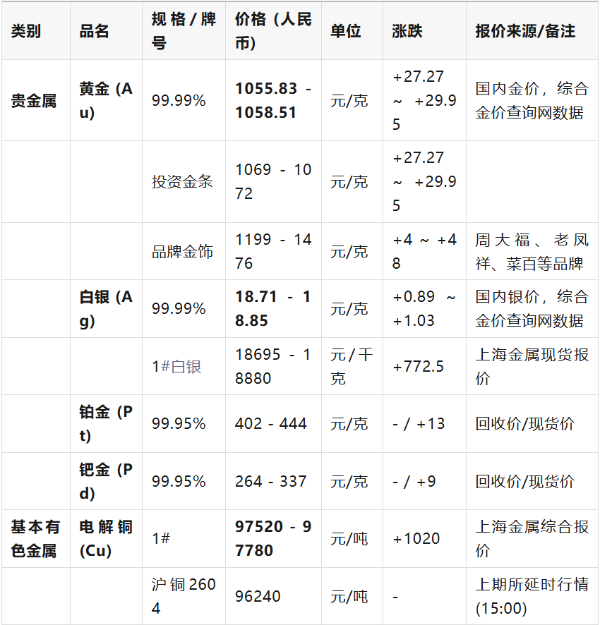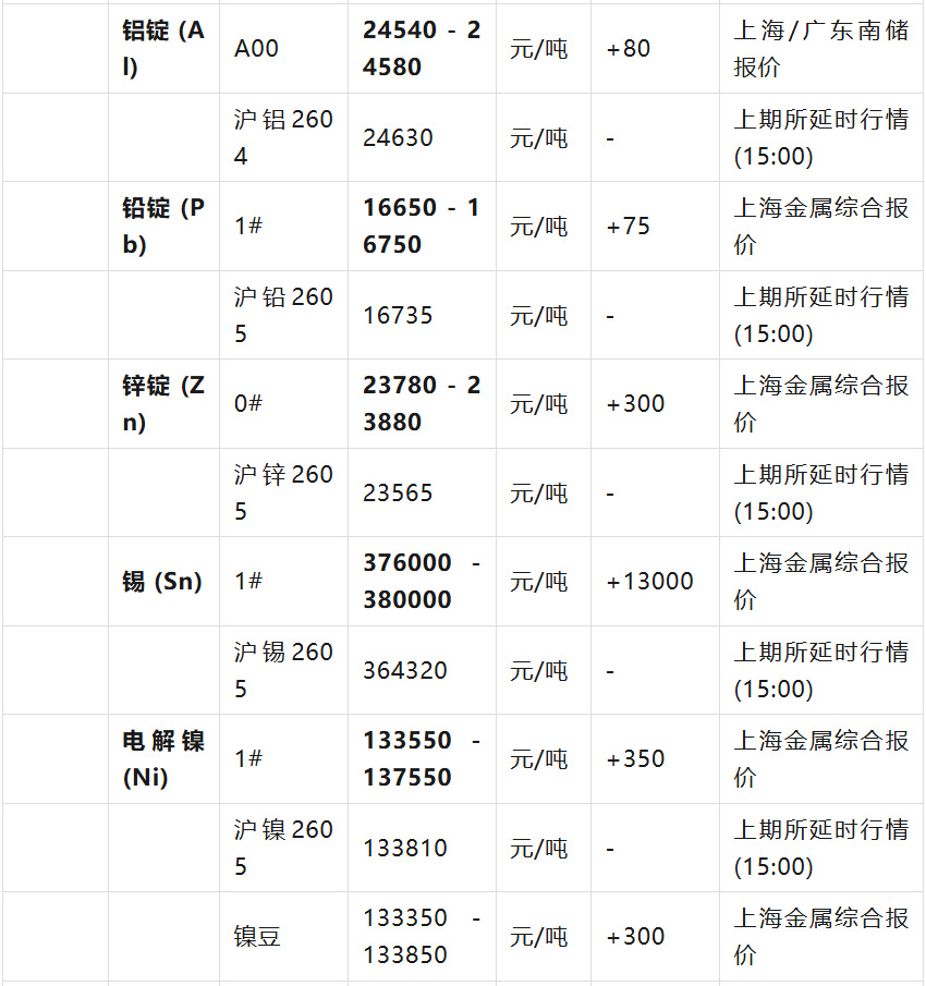 :受地缘政治缓和及美联储降息预期增强影响,美元指数跌破100关口,刺激贵金属价格显著上涨。黄金、白银价格均出现大幅攀升,白银现货价格更是暴涨近1000元/千克,涨幅超过5%。 基本金属普涨,锡价领跑