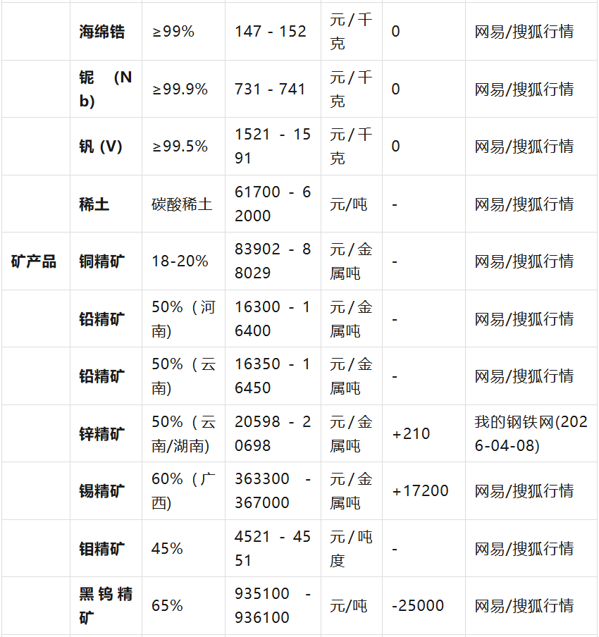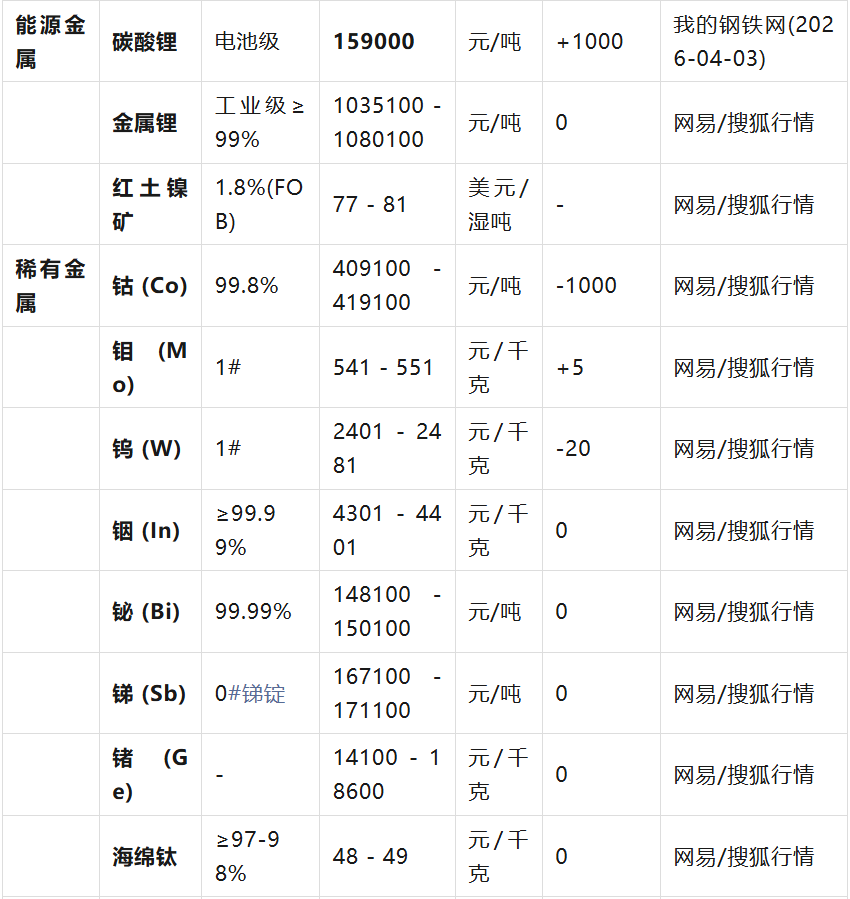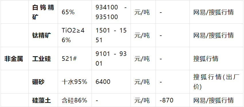:在小金属和矿产品中,市场结构性分化明显。锡精矿价格大涨,而黑钨精矿价格则大幅下跌约25000元/吨。铬、钼价格上涨,钴、钨价格下跌。 能源金属相对平稳