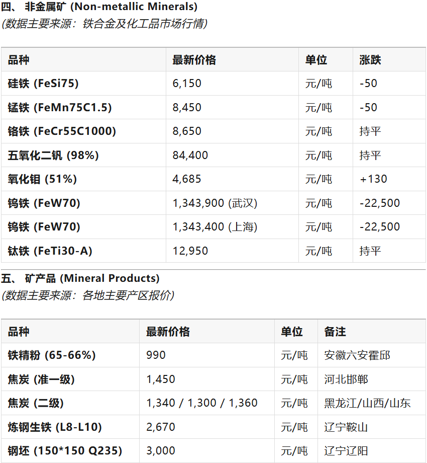 科矿|4月15日金属、矿产品及非金属现货行情报价单