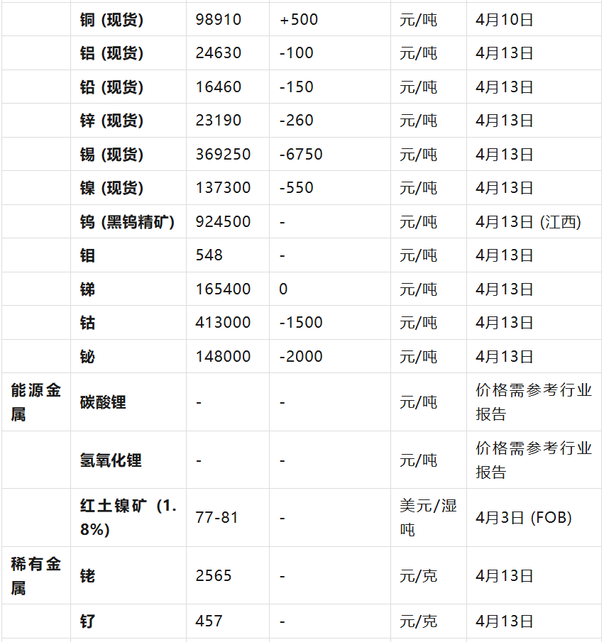 :部分能源金属(如锂)和稀有金属(如稀土)的价格在搜索结果中未提供实时报价,通常需要参考专业的行业分析报告或期货平台。红土镍矿的报价为4月3日数据,具有一定时效性。