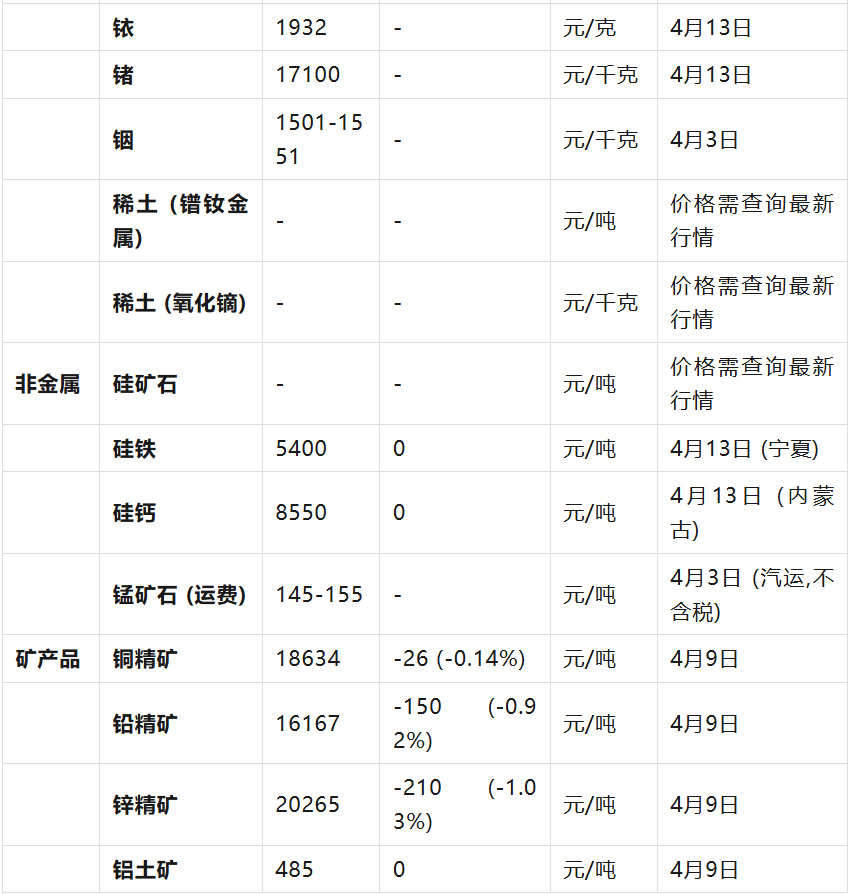 :此类产品价格相对分散,且报价频率较低。表中列出的硅铁、硅钙、锰矿石运费等为特定地区和时间的报价,仅供参考。矿产品(如铜精矿、锌精矿)价格随大宗商品市场波动。