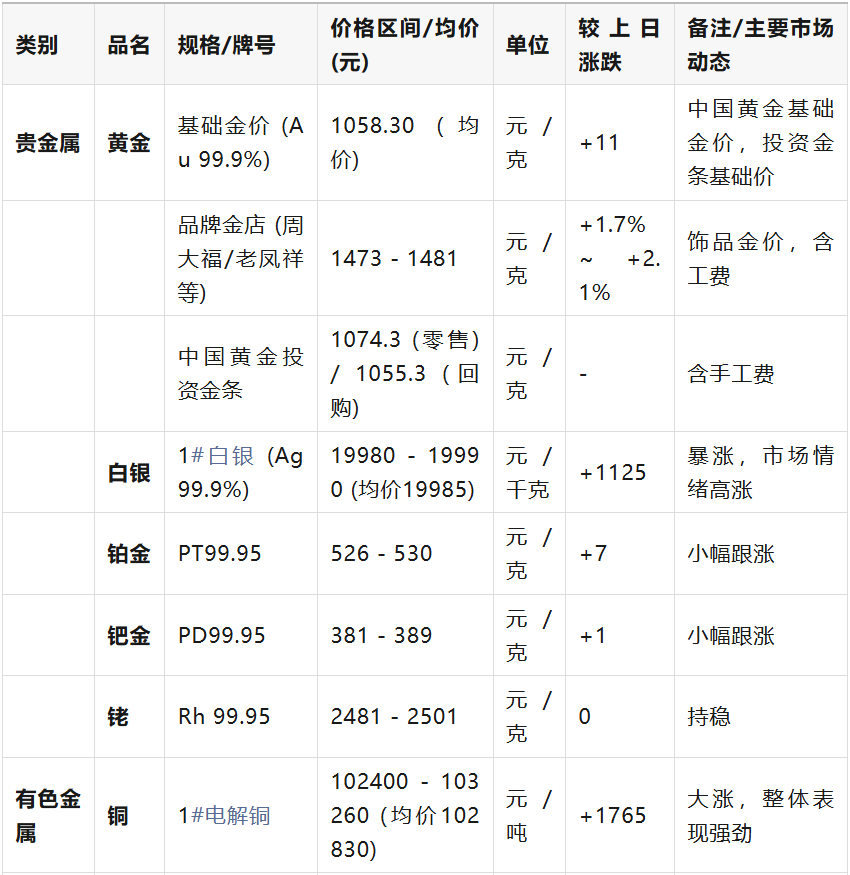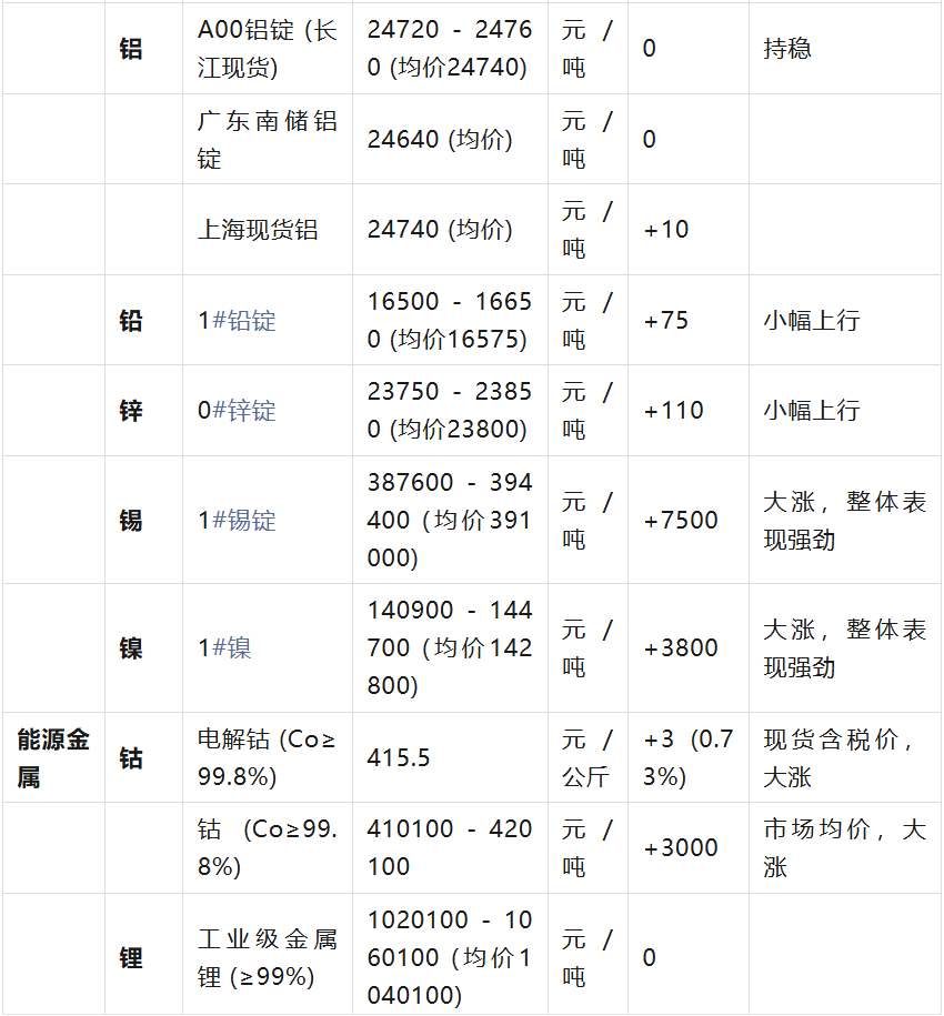 :综合参考了上海金属现货、长江有色金属、中色网、同花顺财经、东方财富等多家权威市场信息平台。 价格单位