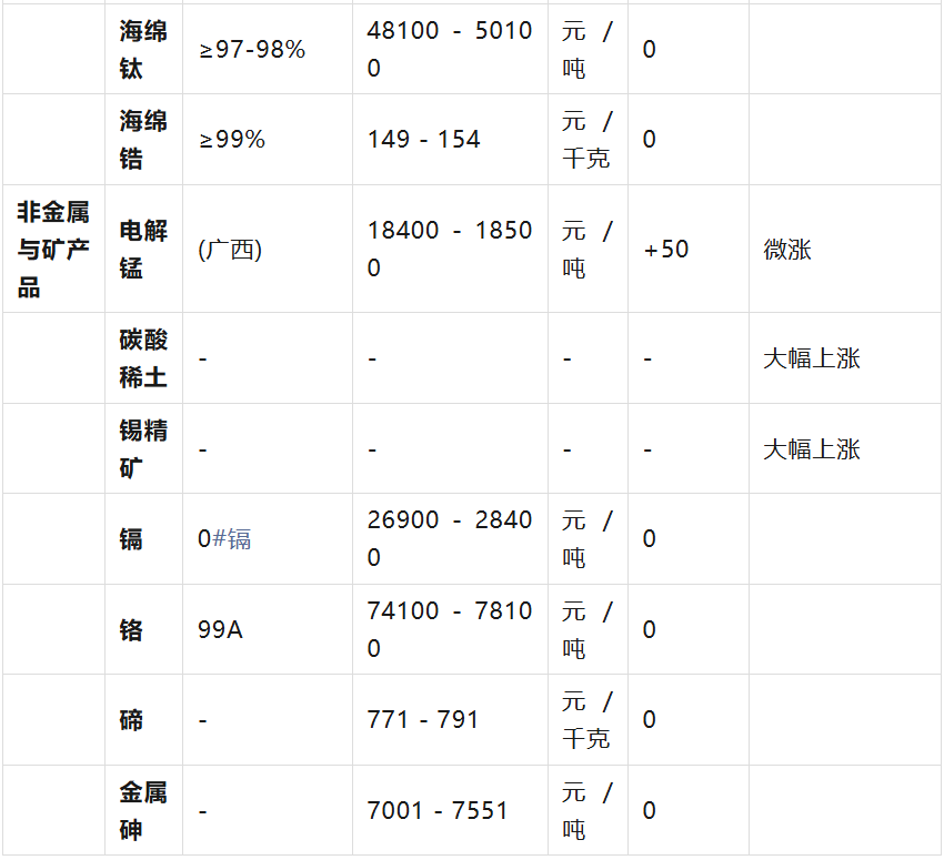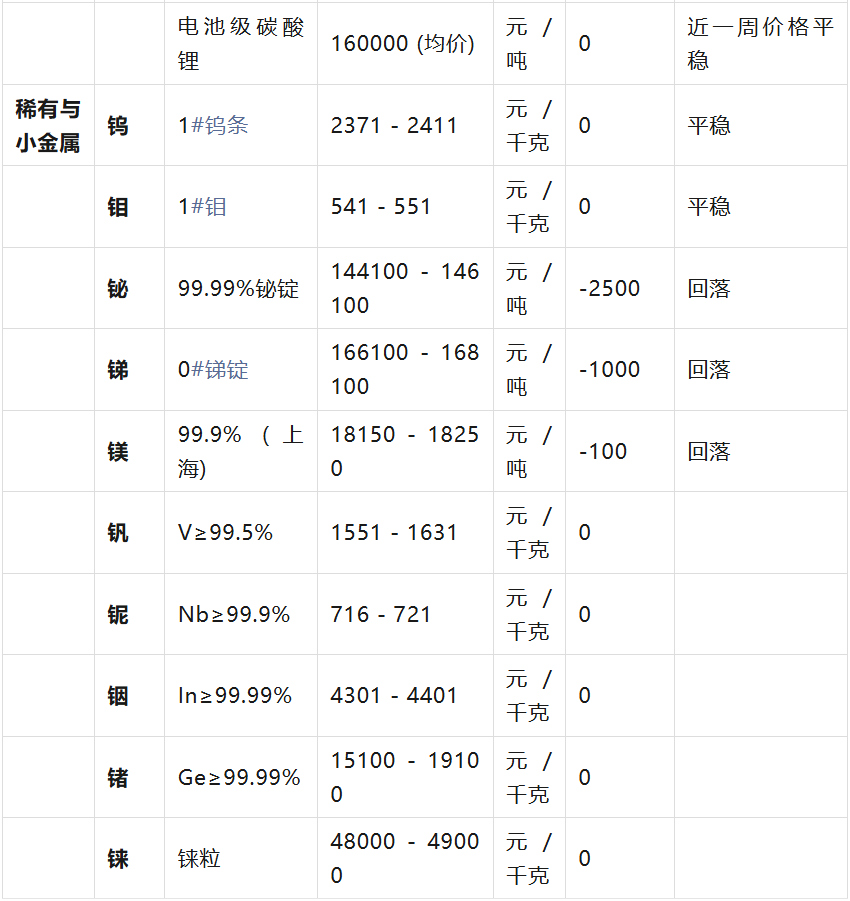 :钴价大幅上涨3000元/吨,电解钴现货价格上涨3元/公斤(0.73%)。锂价近期保持平稳。 部分小金属回调