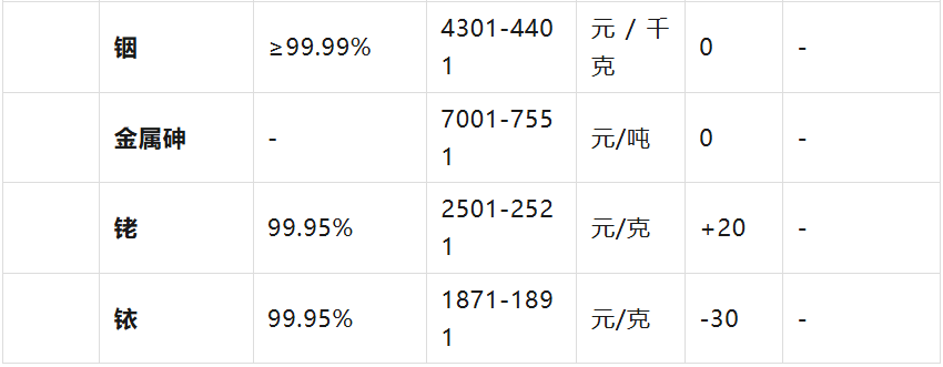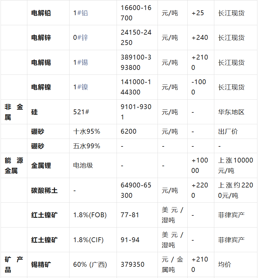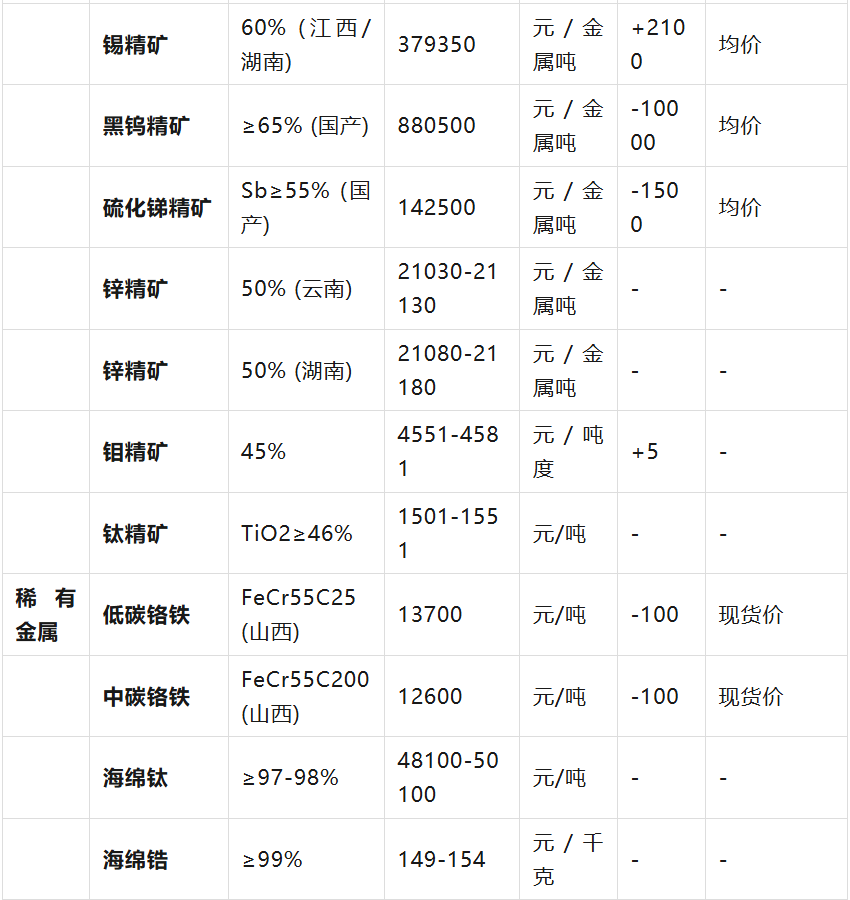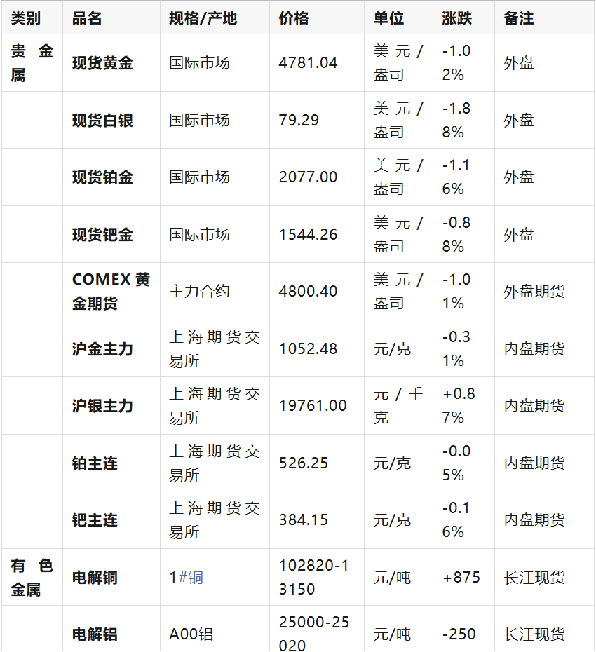 价格来源于同花顺财经网。 表格中的“涨跌”列,部分为直接引用的涨跌数值(如电解铜+875元/吨),部分为计算出的涨跌幅百分比(如现货黄金-1.02%),具体请参考“备注”和“单位”列。 因市场信息庞杂,部分品种可能只有主要产区或市场的报价,未能穷尽所有规格和产地。