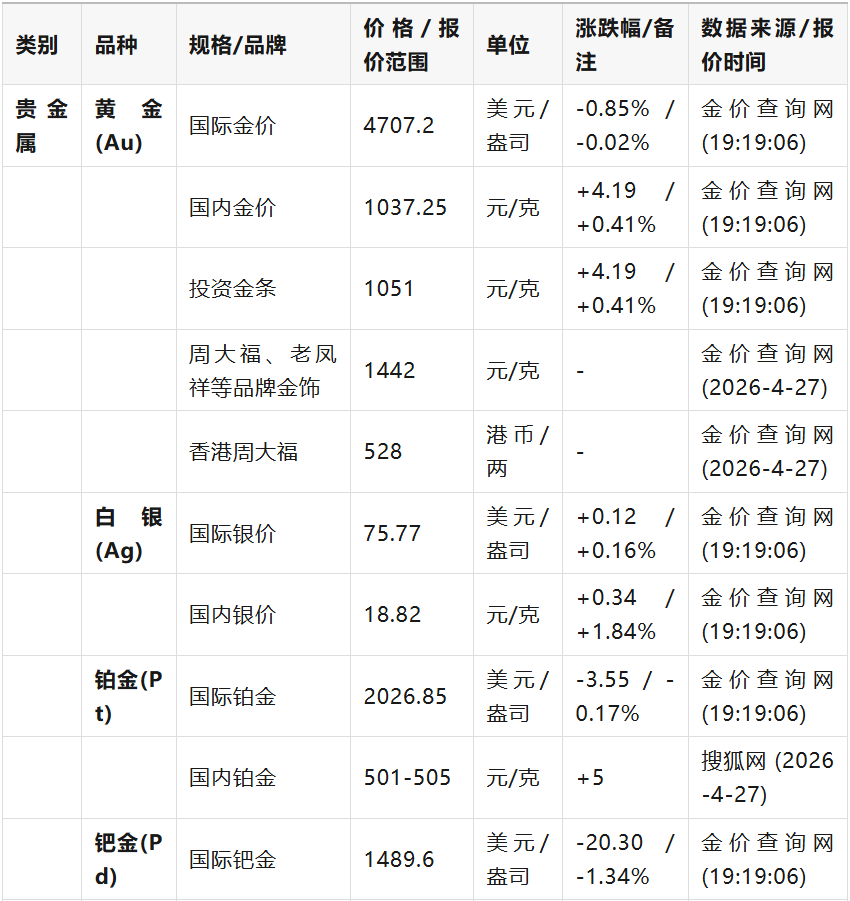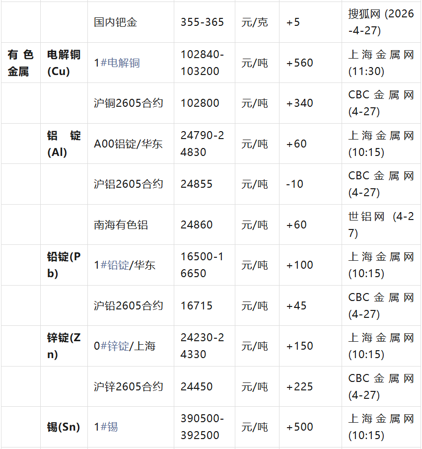 :以上价格为2026年4月27日的市场报价,金属市场价格波动剧烈,请以您交易时的实时报价为准,仅供参考,不构成投资建议。。